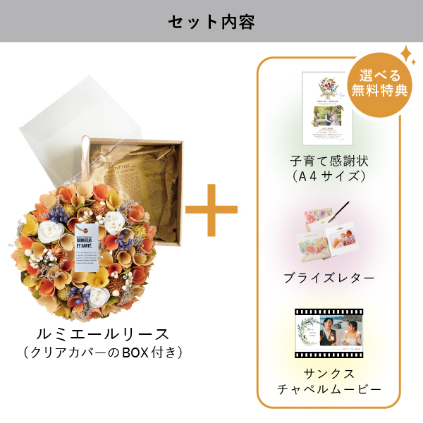 | 無料特典 | ブライズレター1セット(レターケース、専用レター5枚)、子育て感謝状(A4サイズ)(※フレームは付きません。)、サンクスチャペルムービーの中から1つお選びいただけます。 |