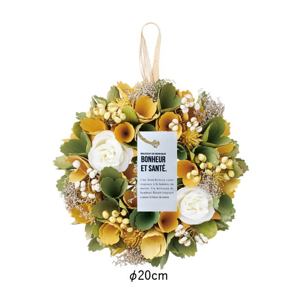 明るさや元気、幸せ、輝きなどのイメージのあるイエロー。ころんとした小さめのリースなら机の上でも邪魔になりません。