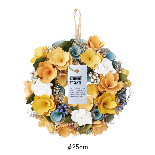 明るさや元気、幸せ、輝きなどのイメージのあるイエロー。程よい大きさのリースなので、飾る場所を選びません。