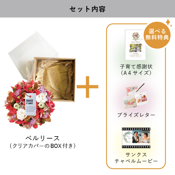 | 無料特典 | ブライズレター1セット(レターケース、専用レター5枚)、子育て感謝状(A4サイズ)(※フレームは付きません。)、サンクスチャペルムービーの中から1つお選びいただけます。 |