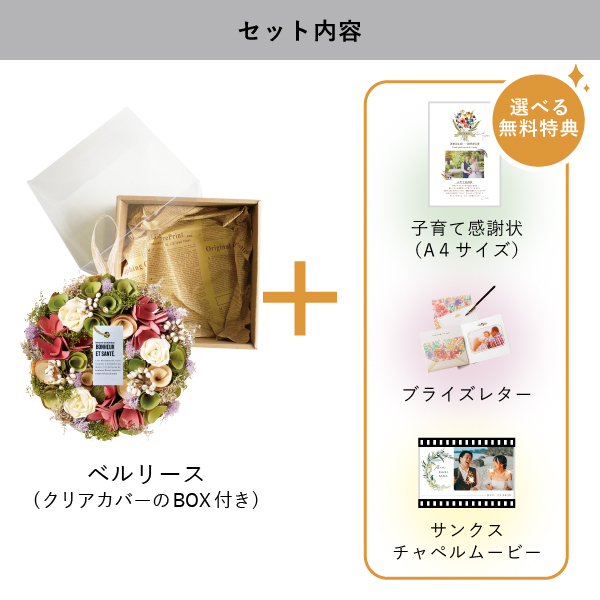 | 無料特典 | ブライズレター1セット(レターケース、専用レター5枚)、子育て感謝状(A4サイズ)(※フレームは付きません。)、サンクスチャペルムービーの中から1つお選びいただけます。 |