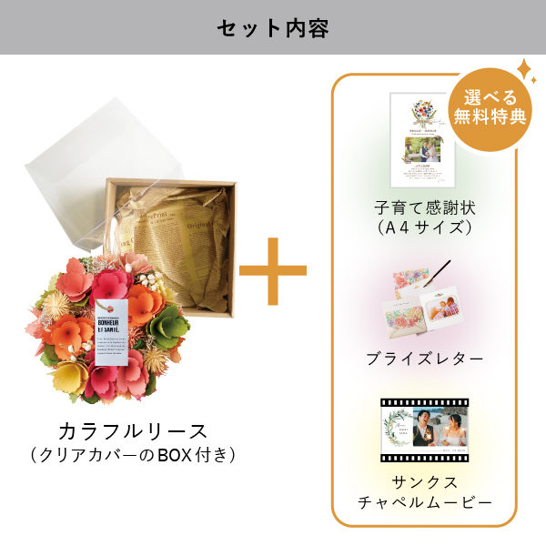 | 無料特典 | ブライズレター1セット(レターケース、専用レター5枚)、子育て感謝状(A4サイズ)(※フレームは付きません。)、サンクスチャペルムービーの中から1つお選びいただけます。 |