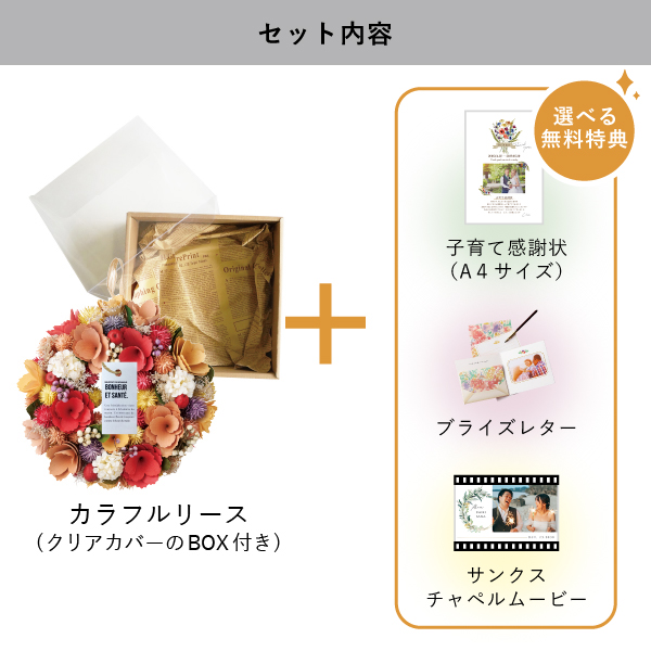 | 無料特典 | ブライズレター1セット(レターケース、専用レター5枚)、子育て感謝状(A4サイズ)(※フレームは付きません。)、サンクスチャペルムービーの中から1つお選びいただけます。 |