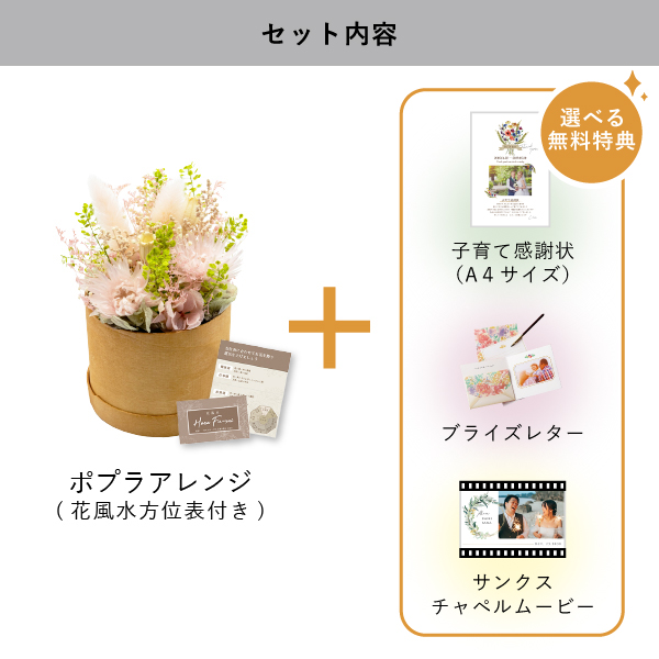 | 無料特典 | ブライズレター1セット(レターケース、専用レター5枚)、子育て感謝状(A4サイズ)(※フレームは付きません。)、サンクスチャペルムービーの中から1つお選びいただけます。 |