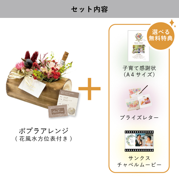 | 無料特典 | ブライズレター1セット(レターケース、専用レター5枚)、子育て感謝状(A4サイズ)(※フレームは付きません。)、サンクスチャペルムービーの中から1つお選びいただけます。 |