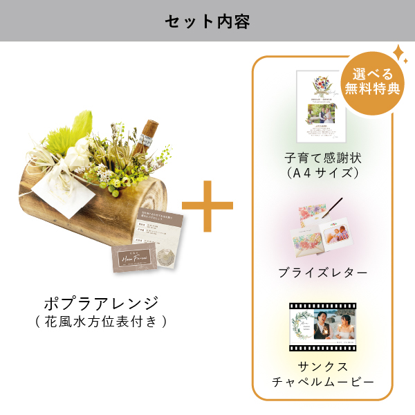 | 無料特典 | ブライズレター1セット(レターケース、専用レター5枚)、子育て感謝状(A4サイズ)(※フレームは付きません。)、サンクスチャペルムービーの中から1つお選びいただけます。 |