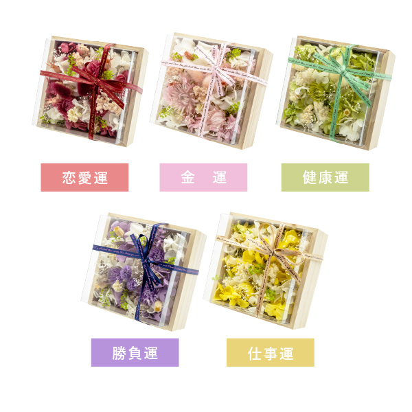 花風水には、恋愛運・金運・仕事運・勝負運・健康運の5つの運気があります。伝えたい想いでお花の色を選んでください。