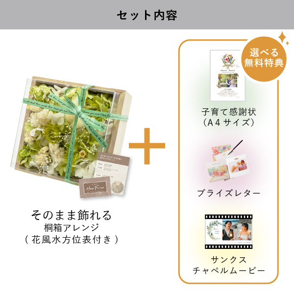 | 無料特典 | ブライズレター1セット(レターケース、専用レター5枚)、子育て感謝状(A4サイズ)(※フレームは付きません。)、サンクスチャペルムービーの中から1つお選びいただけます。 |