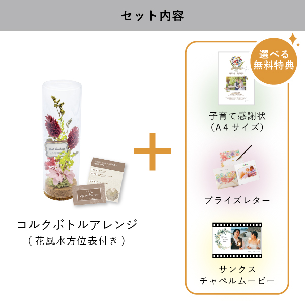 | 無料特典 | ブライズレター1セット(レターケース、専用レター5枚)、子育て感謝状(A4サイズ)(※フレームは付きません。)、サンクスチャペルムービーの中から1つお選びいただけます。 |