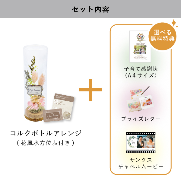 | 無料特典 | ブライズレター1セット(レターケース、専用レター5枚)、子育て感謝状(A4サイズ)(※フレームは付きません。)、サンクスチャペルムービーの中から1つお選びいただけます。 |