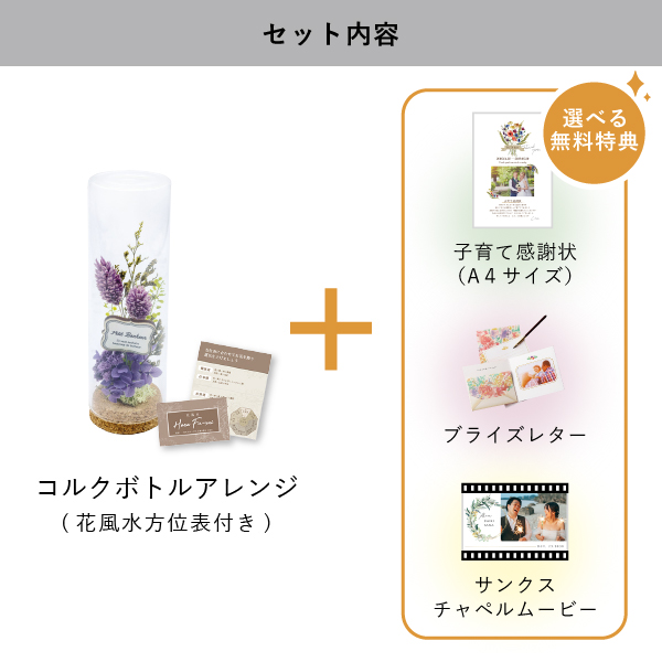 | 無料特典 | ブライズレター1セット(レターケース、専用レター5枚)、子育て感謝状(A4サイズ)(※フレームは付きません。)、サンクスチャペルムービーの中から1つお選びいただけます。 |