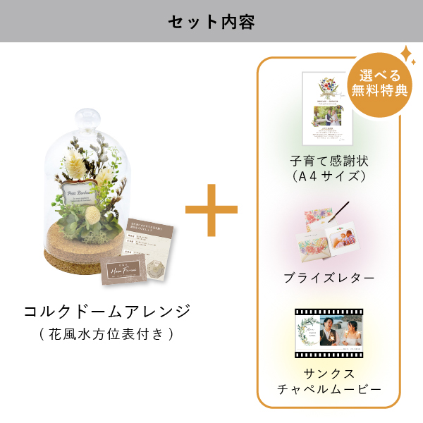 | 無料特典 | ブライズレター1セット(レターケース、専用レター5枚)、子育て感謝状(A4サイズ)(※フレームは付きません。)、サンクスチャペルムービーの中から1つお選びいただけます。 |