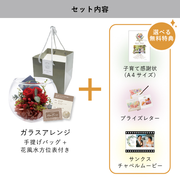 | 無料特典 | ブライズレター1セット(レターケース、専用レター5枚)、子育て感謝状(A4サイズ)(※フレームは付きません。)、サンクスチャペルムービーの中から1つお選びいただけます。 |