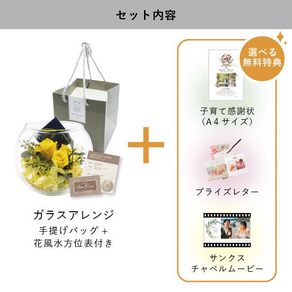 | 無料特典 | ブライズレター1セット(レターケース、専用レター5枚)、子育て感謝状(A4サイズ)(※フレームは付きません。)、サンクスチャペルムービーの中から1つお選びいただけます。 |