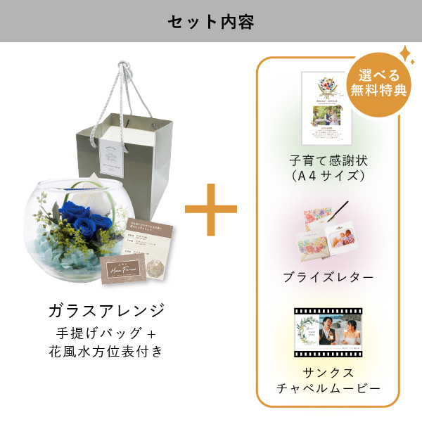 | 無料特典 | ブライズレター1セット(レターケース、専用レター5枚)、子育て感謝状(A4サイズ)(※フレームは付きません。)、サンクスチャペルムービーの中から1つお選びいただけます。 |