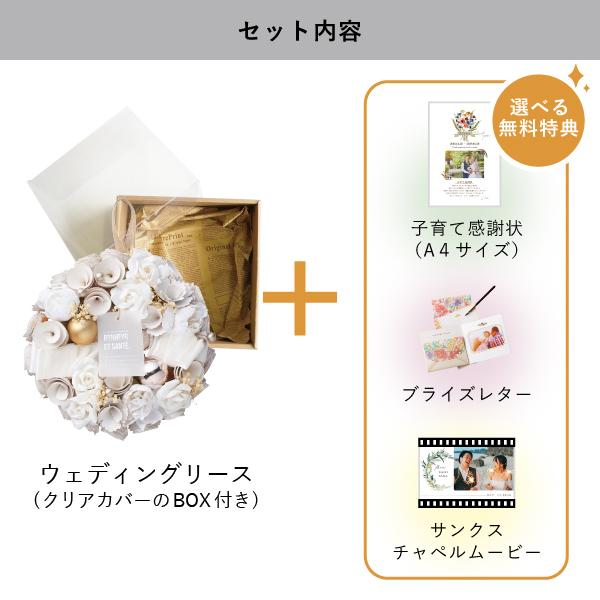 | 無料特典 | ブライズレター1セット(レターケース、専用レター5枚)、子育て感謝状(A4サイズ)(※フレームは付きません。)、サンクスチャペルムービーの中から1つお選びいただけます。 |