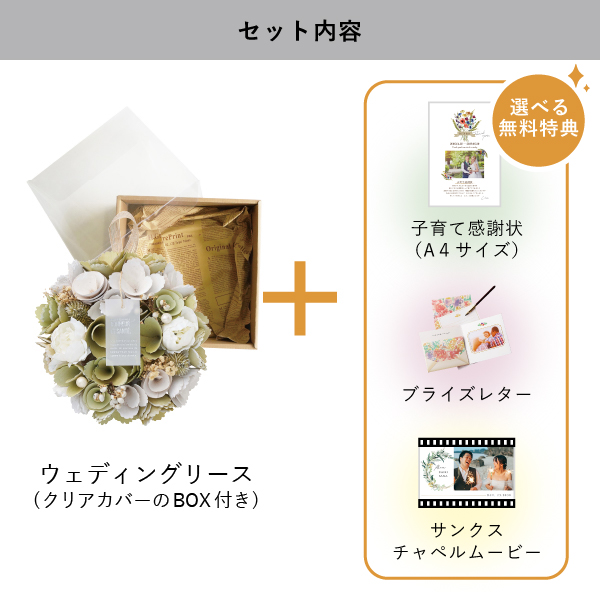 | 無料特典 | ブライズレター1セット(レターケース、専用レター5枚)、子育て感謝状(A4サイズ)(※フレームは付きません。)、サンクスチャペルムービーの中から1つお選びいただけます。 |