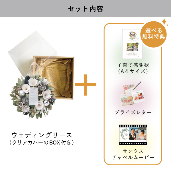 | 無料特典 | ブライズレター1セット(レターケース、専用レター5枚)、子育て感謝状(A4サイズ)(※フレームは付きません。)、サンクスチャペルムービーの中から1つお選びいただけます。 |