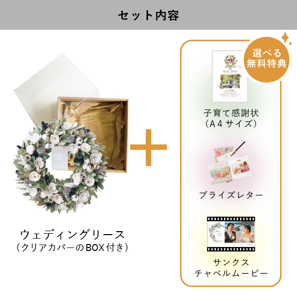 | 無料特典 | ブライズレター1セット(レターケース、専用レター5枚)、子育て感謝状(A4サイズ)(※フレームは付きません。)、サンクスチャペルムービーの中から1つお選びいただけます。 |