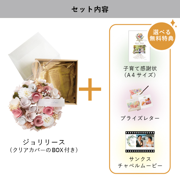 | 無料特典 | ブライズレター1セット(レターケース、専用レター5枚)、子育て感謝状(A4サイズ)(※フレームは付きません。)、サンクスチャペルムービーの中から1つお選びいただけます。 |