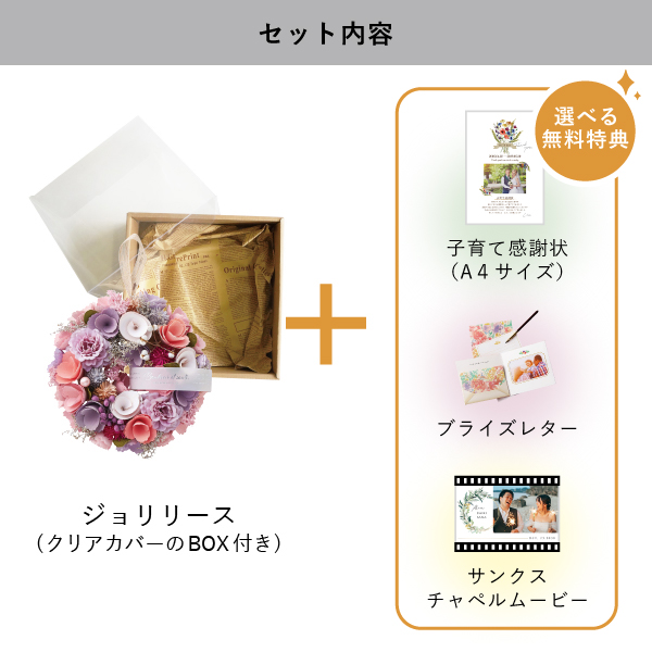 | 無料特典 | ブライズレター1セット(レターケース、専用レター5枚)、子育て感謝状(A4サイズ)(※フレームは付きません。)、サンクスチャペルムービーの中から1つお選びいただけます。 |