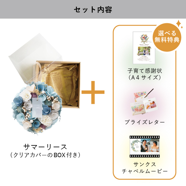 | 無料特典 | ブライズレター1セット(レターケース、専用レター5枚)、子育て感謝状(A4サイズ)(※フレームは付きません。)、サンクスチャペルムービーの中から1つお選びいただけます。 |