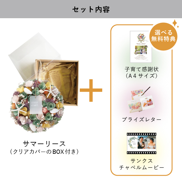 | 無料特典 | ブライズレター1セット(レターケース、専用レター5枚)、子育て感謝状(A4サイズ)(※フレームは付きません。)、サンクスチャペルムービーの中から1つお選びいただけます。 |