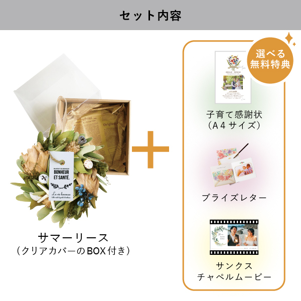 | 無料特典 | ブライズレター1セット(レターケース、専用レター5枚)、子育て感謝状(A4サイズ)(※フレームは付きません。)、サンクスチャペルムービーの中から1つお選びいただけます。 |