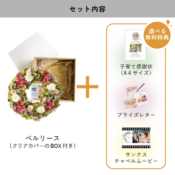 | 無料特典 | ブライズレター1セット(レターケース、専用レター5枚)、子育て感謝状(A4サイズ)(※フレームは付きません。)、サンクスチャペルムービーの中から1つお選びいただけます。 |