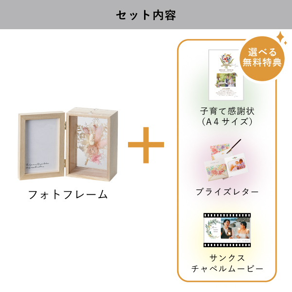 | 無料特典 | ブライズレター1セット(レターケース、専用レター5枚)、子育て感謝状(A4サイズ)(※フレームは付きません。)、サンクスチャペルムービーの中から1つお選びいただけます。 |