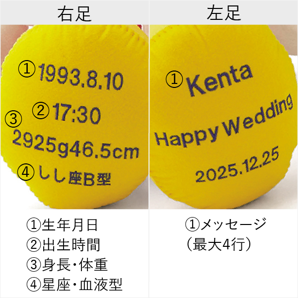 右足・左足にそれぞれ誕生日やメッセージなどの刺繍を入れることができます。
