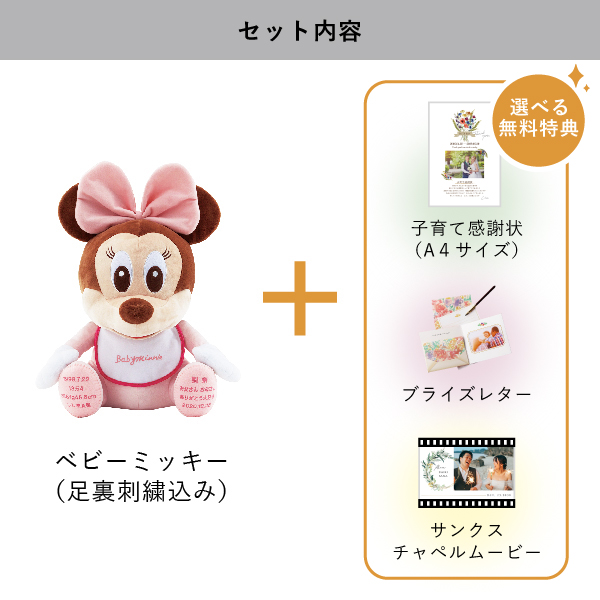 | 無料特典 | ブライズレター1セット(レターケース、専用レター5枚)、子育て感謝状(A4サイズ)(※フレームは付きません。)、サンクスチャペルムービーの中から1つお選びいただけます。 |