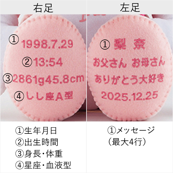 右足・左足にそれぞれ誕生日やメッセージなどの刺繍を入れることができます。