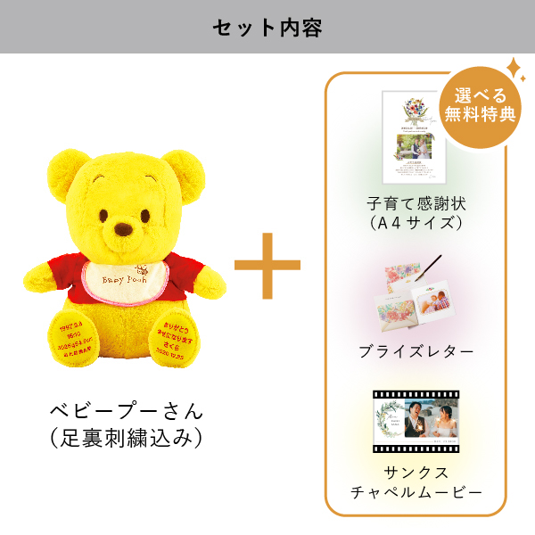 | 無料特典 | ブライズレター1セット(レターケース、専用レター5枚)、子育て感謝状(A4サイズ)(※フレームは付きません。)、サンクスチャペルムービーの中から1つお選びいただけます。 |