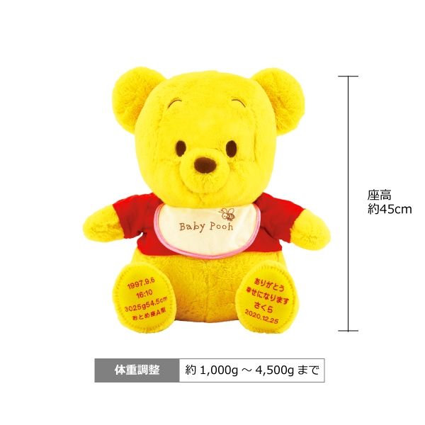 | 備考 | 表地100%ソフトボア・中綿ポリエステル・マイクロサンド・樹脂製ペレット 中国製 保証書付き この商品は香港ディズニーのライセンシーです。 ラッピング:透明セロハンにお包みし、トップをリボンで結んでいます。 身長は出生時の身長に近い約45.6cmで制作いたします。 |