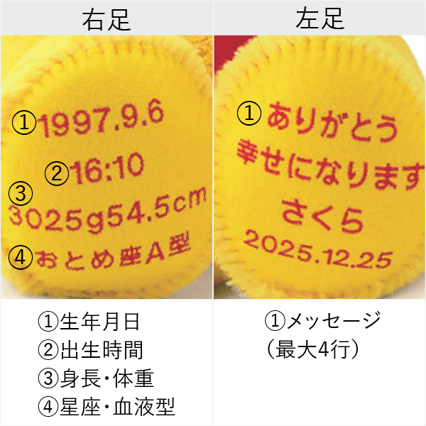 右足・左足にそれぞれ誕生日やメッセージなどの刺繍を入れることができます。
