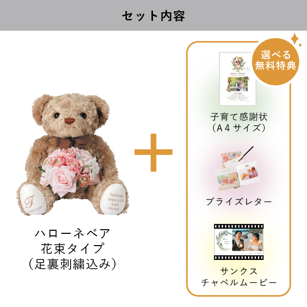 | 無料特典 | ブライズレター1セット(レターケース、専用レター5枚)、子育て感謝状(A4サイズ)(※フレームは付きません。)、サンクスチャペルムービーの中から1つお選びいただけます。 |