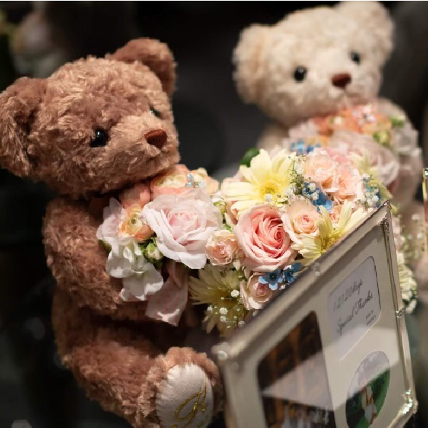 愛らしい瞳で花束を差し出すハローネベアに、ご両親の涙も思わず笑顔に変わります。