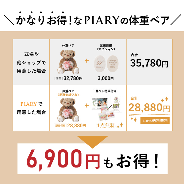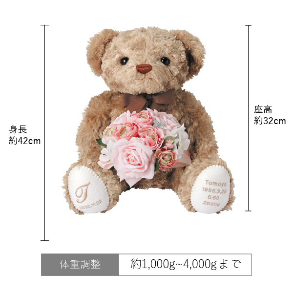手に伝わる重みに大きな責任と喜びを感じたあの日が蘇り、立派に成長したおふたりの姿により一層の幸せを感じるウェイトテディベア。