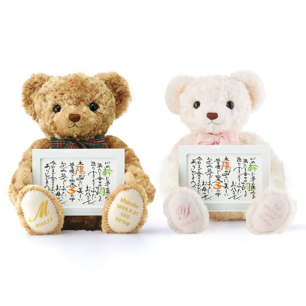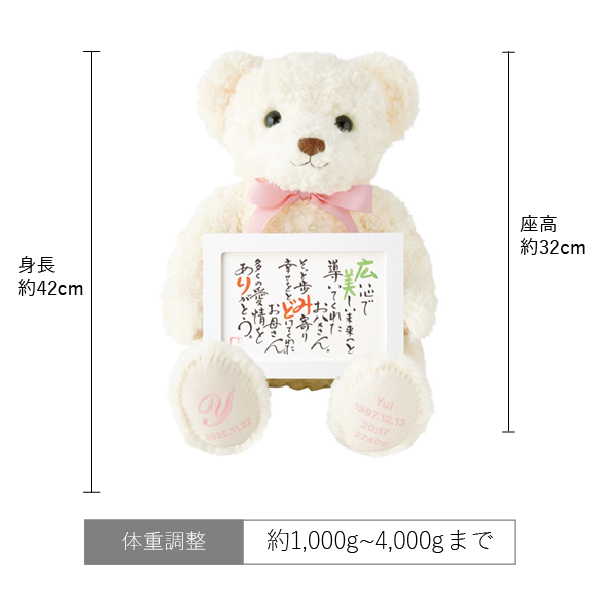 手に伝わる重みに大きな責任と喜びを感じたあの日が蘇り、立派に成長したおふたりの姿により一層の幸せを感じるウェイトテディベア。