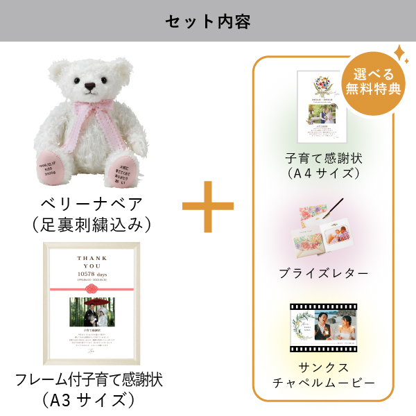 純白のふわふわな毛並みが特徴のベリーナベアと、これまで育ててくれたご両親への想いを込めた子育て感謝状の、たくさんの感謝の気持ちが詰まったセットです。