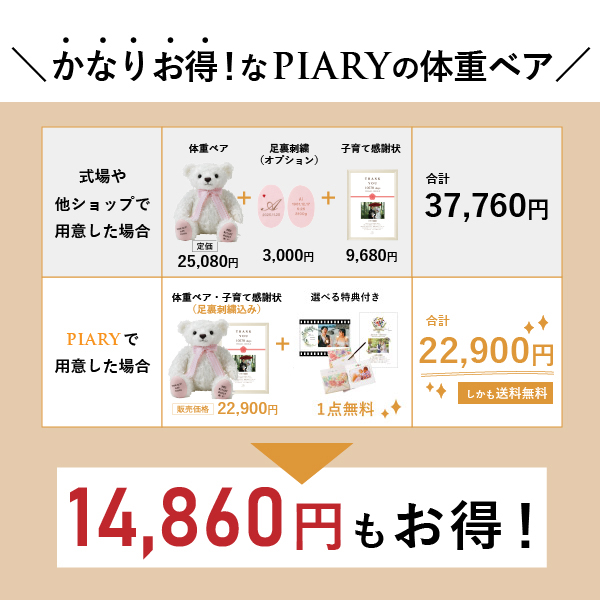 両親プレゼントは体重ベアと決めていました!ピアリーさんのサイトを見ていると、体重ベアと子育て感謝状のセットがあったのでこちらに決定♪可愛すぎる&オシャレで大満足です!