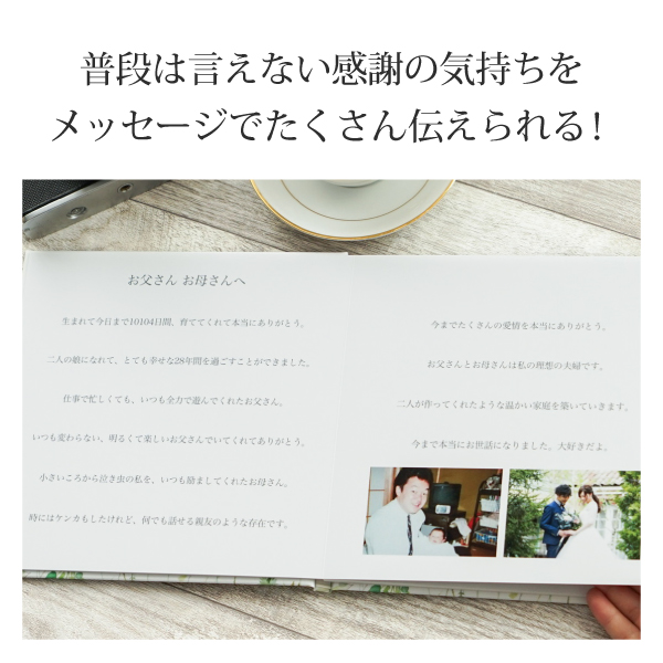 両親への感謝の言葉をつづるレターセット。写真を入れることができて、手紙も記念品として贈ることができます!