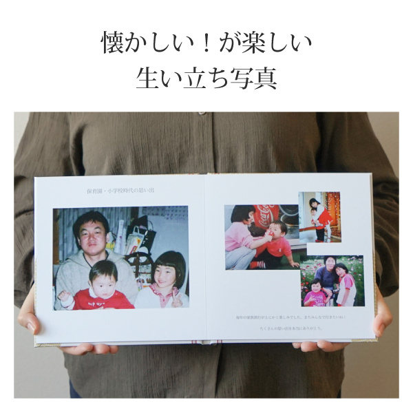 レイアウトに沿って写真やテキストを入れるだけで簡単にオリジナルのアルバムが完成します。