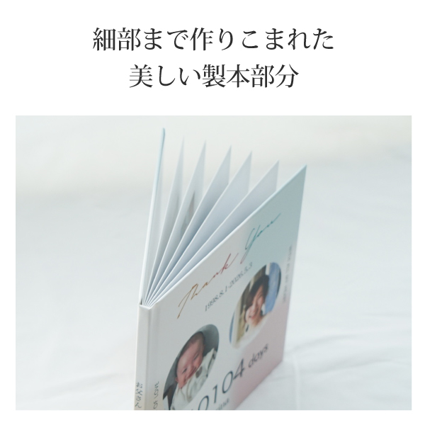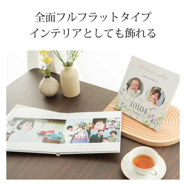 ・見開きでも飾れるフルフラット仕様!表紙だけでなく、ご両親がお気に入りのページを開いて飾っていただくことができます。