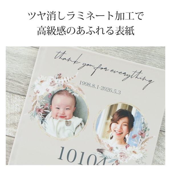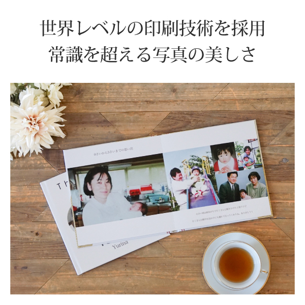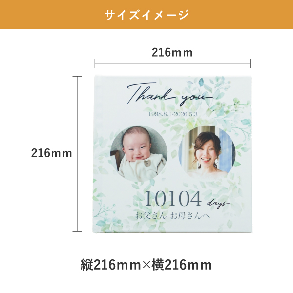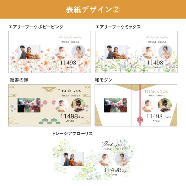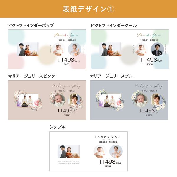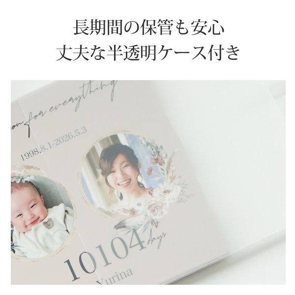 表紙には、生まれてから結婚するまでの日数や、生まれたころと現在のお写真を入れることができます。