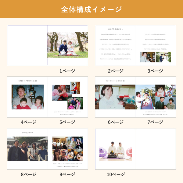 アルバムは、メッセージを記入するページや生い立ち写真を入れるページなど10ページ構成。