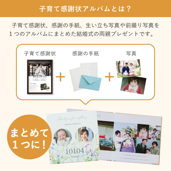 「子育て感謝状」「感謝の手紙」「生い立ち写真や前撮り写真」を1つのアルバムにまとめた、PIARYオリジナルの両親プレゼントです。