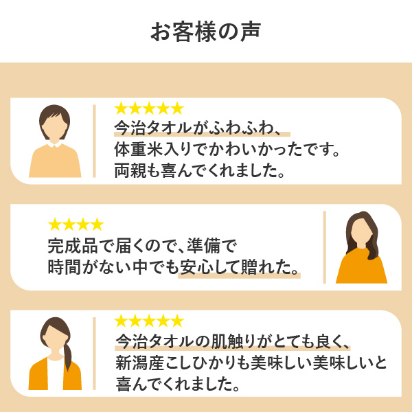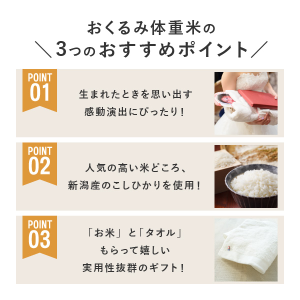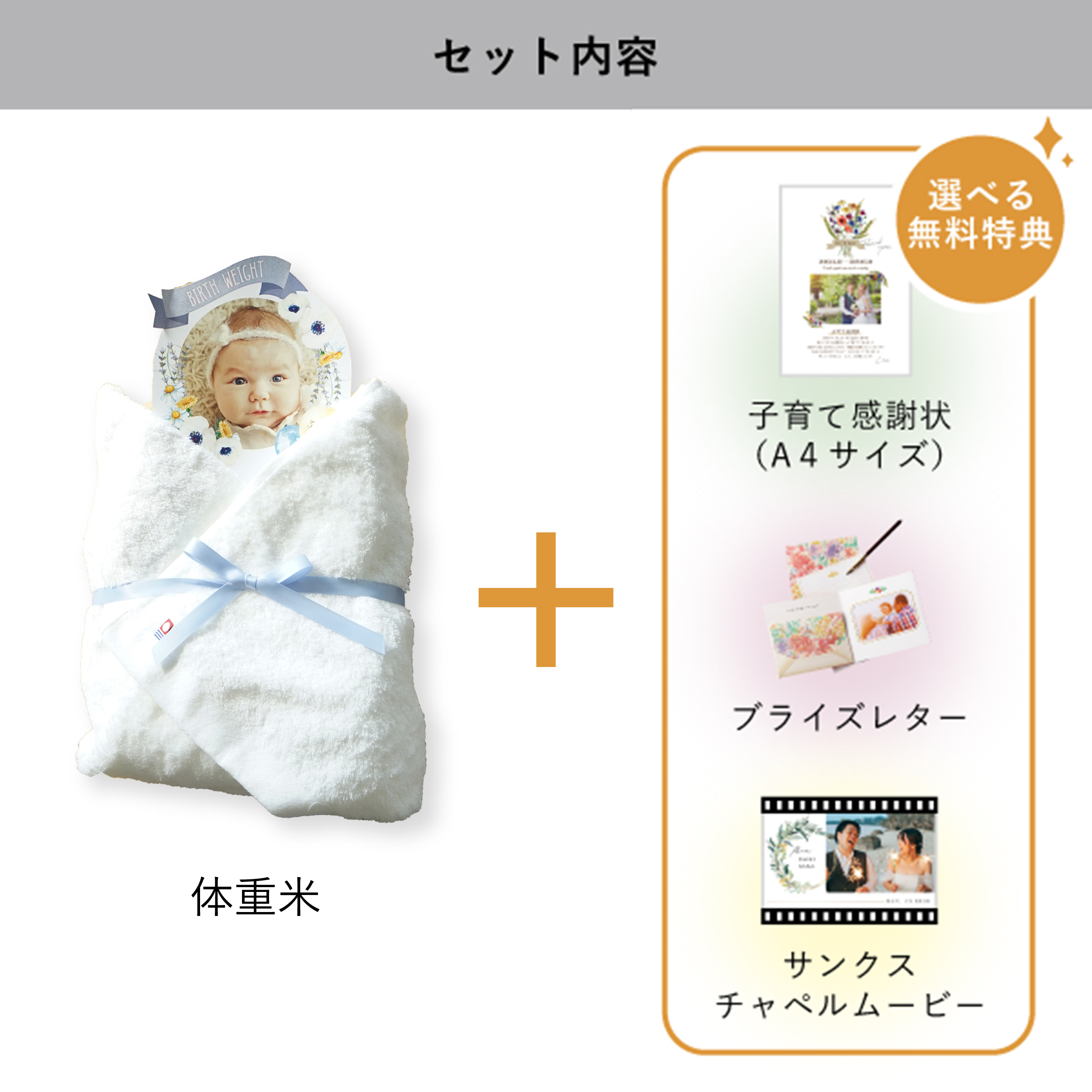 生まれたときと同じ重さのお米を、ふんわりとしたおくるみタオルで優しく包みました。実用的なタオルとお米は、毎日の生活の中で使っていただける、もらって嬉しいプレゼントです。