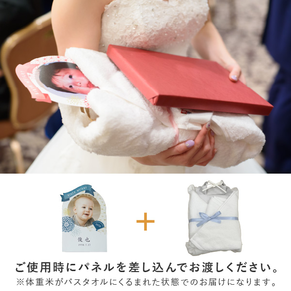 タオルは上質な今治タオルを使用し、お米は新潟産こしひかりを使用しているため、記念品よりも実用的なものが喜ばれるご両親におすすめです。タオルにくるまれた体重米には、生まれたばかりのあなたの写真が入ったパネルを添えられます。ご両親があなたを初めて抱きしめた日の感動と喜びを、結婚式という特別な日に改めて伝えませんか?これまでの「ありがとう」を形にした、心温まる贈り物です。